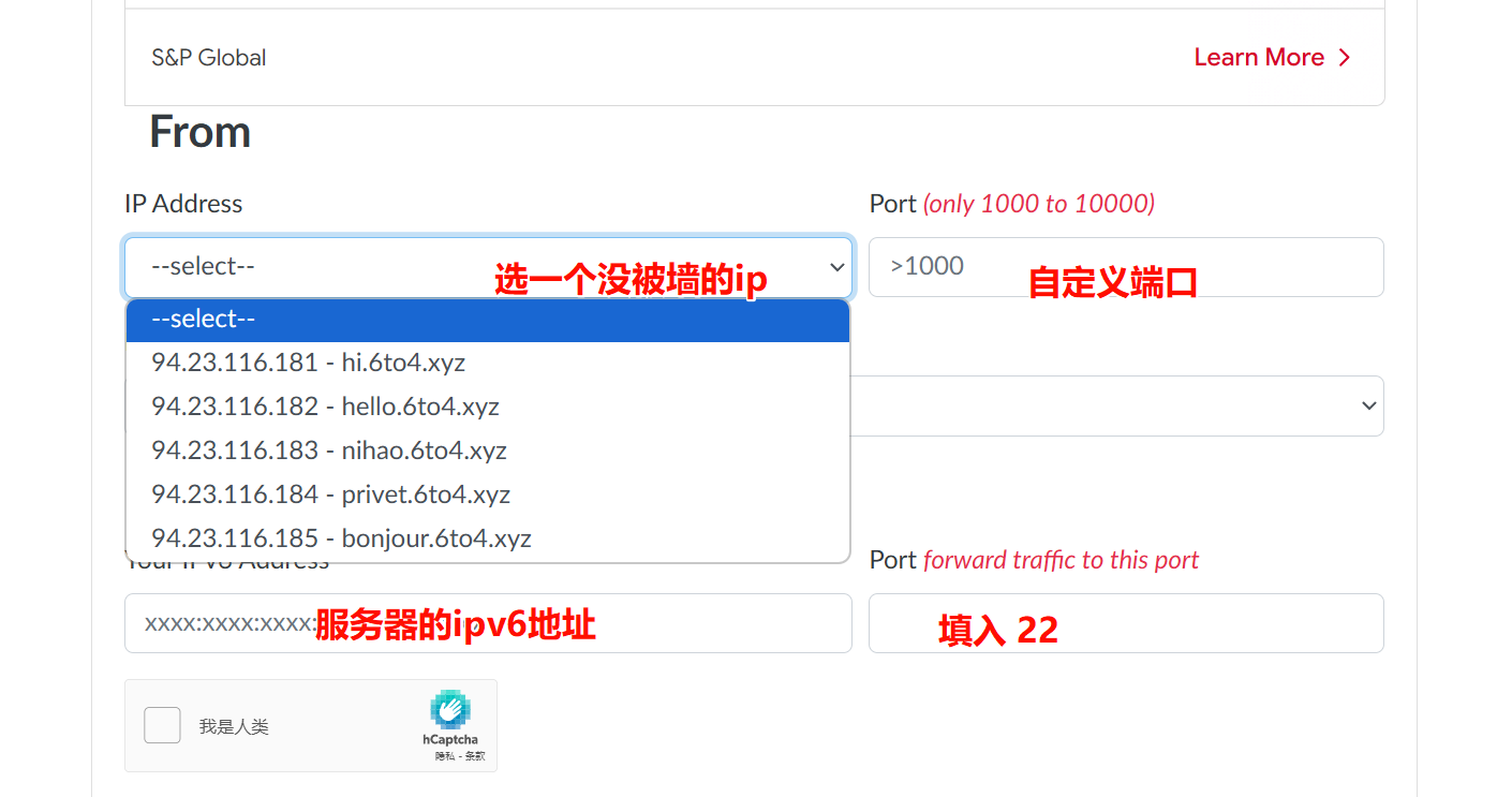 成功之后,使用上面你选定的ip 和自定义端口进行ssh登录。但博主尝试这个功能未能成功,疑似有功能缺陷。如果这个功能不成功,可以尝试挂ipv6节点的梯子,全局代理进行登录。